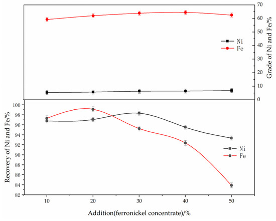The effect of ferronickel concentrate dosage on the grade and recovery of nickel and iron. (The reducing temperature was 1250 °C, the roasting duration was 60 min, the reductant dosage was 8 wt. %, the magnetic separation was 150 mT).