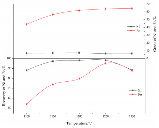 The effect of temperature on the grade and recovery of nickel and iron in ferronickel concentrate. (The ferronickel concentrate dosage was 30 wt. %, the roasting duration was 60 min, the reductant dosage was 8 wt. %, the magnetic separation was 150 mT).