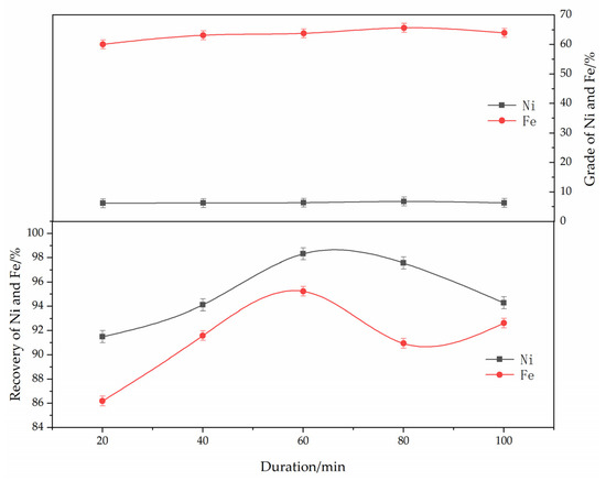 The effect of roasting duration on the grade and recovery of nickel-iron in ferronickel concentrate. (The ferronickel concentrate dosage was 30 wt. %, The reducing temperature was 1250 °C, the reductant dosage was 8 wt. %, the magnetic separation was 150 mT).