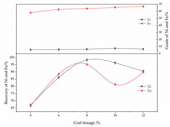 The effect of reductant dosage on the reduction and magnetic separation of low-grade nickel laterite ore is shown in Figure 8. The experimental conditions were determined as follows: ferronickel concentrate dosage of 30%, reduction temperature of 1250 °C, roasting time of 60 min, calcium fluoride content of 7%, magnetic separation intensity of 150 mT. As can be seen from Figure 8, with the increase of reductant dosage, the grade of nickel in ferronickel-concentrate first increased and then decreased, while the grade of iron increased. When reductant dosage increased from 4% to 10%, the nickel grade increased from 5.66% to 7.45%, and the recovery efficiency of nickel increased from 67.0% to 96.3%. However, when the reductant dosage increased to 12%, the grade of the nickel decreased to 6.44%, and the recovery efficiency of nickel was 90.5%. Increasing the reductant dosage can reduce the metal oxides, but excessive residual anthracite will increase the amount of residual carbon, and produce more ash, which leads to the difficulty of migration and aggregation of ferronickel after reduction. Therefore, the smaller ferronickel particles are wrapped by impurities and cannot be separated effectively by magnetic separation. In addition, a large amount of iron oxide becomes reduced to the concentrate. Excessive residual anthracite causes the decrease of the nickel grade in concentrate, therefore the optimum amount of reductant is 8%.