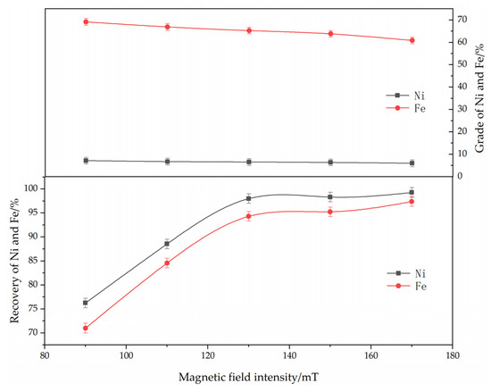 The effect of magnetic separation on the reduction and magnetic separation of low-grade nickel laterite ore is shown in Figure 9. The experimental conditions were determined as follows: ferronickel concentrate dosage of 30%, reduction temperature of 1250 °C, roasting time of 60 min, reductant dosage of 8%, calcium fluoride content of 7%. As can be seen from Figure 9, with an increase in the magnetic field intensity, the grades of iron and nickel in ferronickel concentrate decreased, but the corresponding recovery efficiency increased. This is because that the different size of nickel-iron particles generated in the roasting process caused different forces of these particles in a magnetic field, thereby affecting the magnetic separation effect. The larger particles were easier to adsorb for the magnetic field. When the magnetic field was weak, the small ferronickel particles and some metallic iron inclusions did not become adsorbed by the magnetic field, meaning that the grades of iron and nickel were higher, but the recovery efficiency was low. With the increase in magnetic field intensity, these weak magnetic materials enter the ferronickel concentrate, which reduces the grades of iron and nickel, but the recovery efficiency of iron and nickel increased. Based on the grades and recovery efficiency of iron and nickel in ferronickel concentrate, magnetic field intensity of 150 mT is optimum condition.
