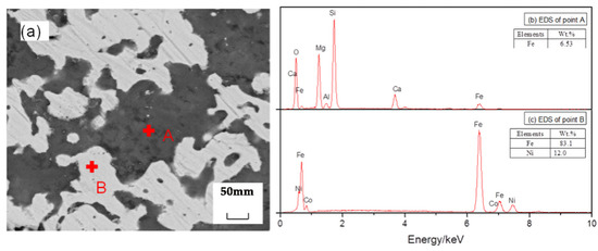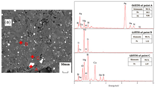 Figure 10 shows an SEM image of the reduction sample under the action of the promoter CaF2. After adding CaF2, part of the nickel and iron oxides was reduced, and the ferronickel concentrate was distributed in a bright white granular form. The grey area is FeO, and the darker area is forsterite [Mg2SiO4]. The study suggested that CaF2, as a promoter, can effectively destroy the mineral lattice which loaded nickel and iron, and reduce the surface tension of the mineral, and promote the metallization and reduction of nickel and iron. Figure 11 shows an SEM image of the reduction sample during the addition of ferronickel concentrate. It can be clearly seen from Figure 11 that the nickel-iron solid solution changes from the original granular distribution to the band shape, indicating that the addition of the ferronickel concentrate can significantly promote the accumulation of ferronickel particles. Figure 12 shows an SEM image of the reduction roasting sample after adding CaF2 and the ferronickel concentrate. It can be clearly seen from Figure 12 that there are a large number of bright white-banded solids of nickel and iron, indicating that the combined action of calcium fluoride and ferronickel concentrate can significantly improve the reduction roasting effect. An EDS analysis of the reduction samples shows that the contents of nickel and iron in the ferronickel concentrate phase were higher under the condition of adding ferronickel concentrate, which further indicates that the addition of the ferronickel concentrate can effectively promote the aggregation and growth of ferronickel particles.