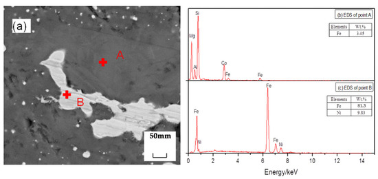 SEM/EDS analysis of reduction samples under the action of ferronickel concentrate; (a) scanning electron microscope image, (b) EDS spectrum of spot A in image (a), (c) EDS spectrum of spot B in image (a).
