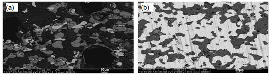 Figure 14 shows an SEM of reduced concentrate samples. Figure 14a shows the SEM of the DC1 interface layer on the surface of the reduced concentrate samples. Nickel and iron oxides were reduced and metallized, and the ferronickel were migrated and aggregated, but the effect of aggregation and growth is not obvious. It is difficult to enrich the fine ferronickel phase by magnetic separation. Figure 14b shows an SEM of the DC2 interface layer on the cross section of the contact between raw ore and concentrate. A large number of bright white and light gray particles are visible in Figure 14b. A large number of bright white bands were formed, as illustrated. The new mineral phases were aggregated to the ferronickel phase. The energy spectrum analysis shows that the main phase in the bright white area of the roasted ore was ferronickel alloy, the main phase in the light gray area was spinel, and the main phase in the light black area was mafic olivine. This indicates that the metallic nickel and iron in the ore migrates and enriches the ferronickel concentrate during reduction roasting, and the size of ferronickel particles significantly increased, which effectively promotes the formation of ferronickel alloy.