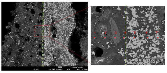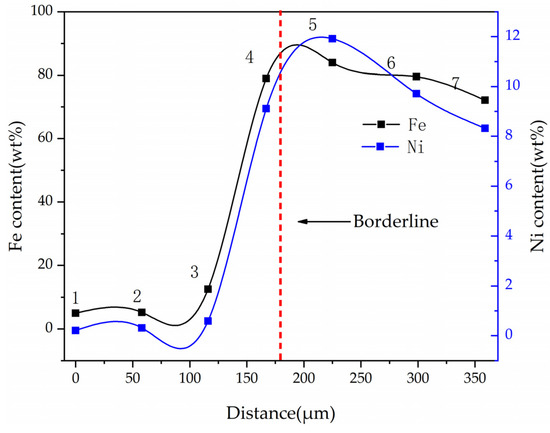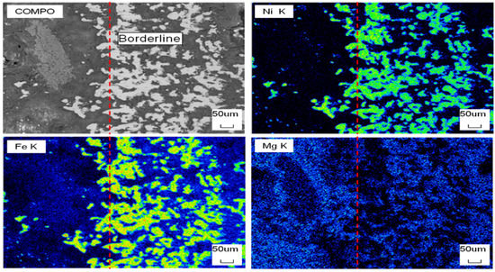 The Ni and Fe contents along a line of selected points were obtained by electron probe shown in Figure 17. When the points of interest were selected, positions that included high contents of nickel and iron were not considered, because these positions represented the alloy phase area. The results show that the nickel and iron contents are highest near the boundary line, and the further away from the boundary line, the lower the contents of nickel and iron at the selected point line. This result is consistent with the elemental mapping results of DC3. The ferronickel particles in the raw ore diffused and migrated to the side of the ferronickel concentrate in the reaction process.