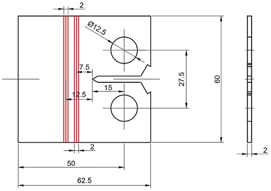 Compact tension C(T) specimens, cut in the T-L orientation, were adopted for the FCG tests. The specimens were manufactured by electrical discharge machining including the notch with a root radius of 0.25 mm. From the preliminary tests, two laser beam heating conditions were selected for the fatigue specimens, namely, the displacement speeds of 1 mm/s and 10 mm/s, both with a laser power level of 200 W. Just like the preliminary test sheets, the FCG specimens were spray painted with carbon black prior to laser irradiation. Each specimen was irradiated with two heating lines on the same side and each heating line was produced by a single laser pass. The position and number of the heating lines were based on the previous work by Cunha and Lima [14]. For comparison, some of the FCG specimens were left in the “as-received” condition (i.e., without laser beam heating line). The specimen dimensions, including the heating lines position, are shown in Figure 1.