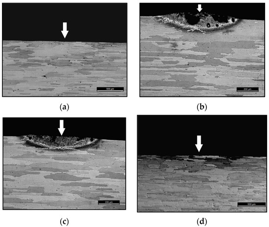 Light optical micrographs of cross sections of heating lines produced with laser power of 200 W and displacement speeds of: (a) 1 mm/s; (b) 2.5 mm/s; (c) 5 mm/s; (d) 10 mm/s (etchant: Keller). The arrows indicate the beam axes.