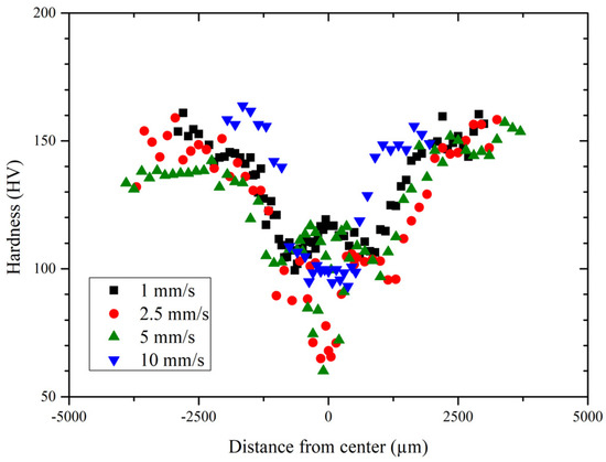For clearness purposes, Vickers hardness profiles for the laser speeds of 1 mm/s and 10 mm/s are plotted again in Figure 9. In these conditions, the hardness was also reduced, although not so much as in the samples presenting a fusion zone (see Figure 3). Moreover, the two conditions resulted in clearly distinct hardness profiles. These features may be discussed based on the premise that hardness in AA2198 depends effectively on the density and size of the strengthening precipitates, which can be strongly affected by the local thermal cycles experienced by the samples during the laser heating.