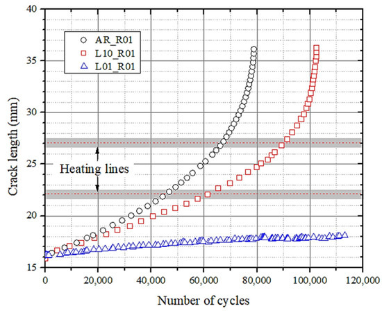 The two promising laser heating conditions (laser power 200 W and speeds of 1 mm/s and 10 mm/s), from here referred to as L01 and L10, were adopted for the fatigue crack growth tests in a comparative study with the as-received (AR) material. The raw fatigue crack growth data obtained in the tests with load ratios R = 0.1 (with Pmax = 800 N) and R = 0.5 (with Pmax = 1.1 kN) are plotted in Figure 4 and Figure 5, respectively.