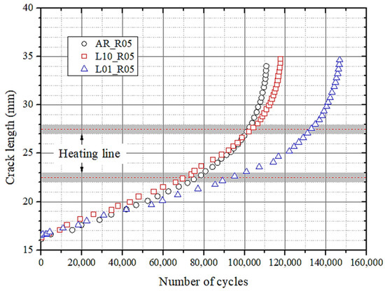 FCG test results: crack length vs. number of cycles for R = 0.5.