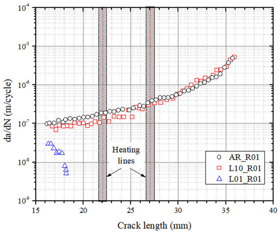 It is noticeable that a crack arrest occurred in L01-R01 FCG test (Figure 4), which was interrupted after approximately 115,000 cycles and 3 mm crack length increase. A deviation of 12° was observed in the arrested crack growth direction, after an initial growth normal to the loading direction. The other test conditions did not show significant crack deflection. The drop in the crack growth rate can be also observed in Figure 6, in which da/dN calculated by the secant method is plotted against crack size for the R = 0.1 tests. The maximum load in that test was then increased from 800 N to 1.1 kN and the test was resumed. Another L01-R01 test with increased load (Pmax = 1.6 kN) was also performed from the beginning for the da/dN-ΔK analyzes. The calculations of ΔK were done according to ASTM E647-15e1.