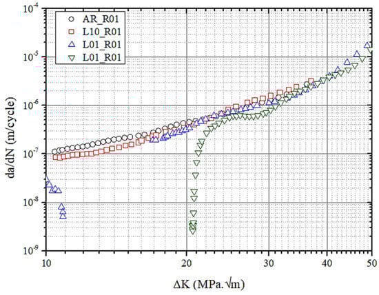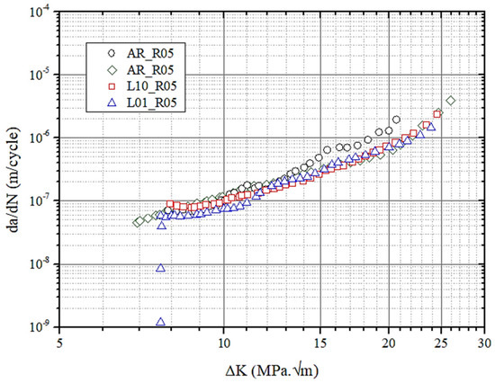Figure 7 and Figure 8 present, in bi-logarithmic scale, the fatigue crack growth rate in terms of the stress intensity factor range (ΔK) nominal values. In both loading conditions (R = 0.1 and R = 0.5) it was observed that FCG rates of L01 specimens started from lower levels.