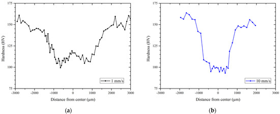 Hardness profiles beneath the laser irradiated surfaces with laser speeds of (a) 1 mm/s; (b) 10 mm/s.