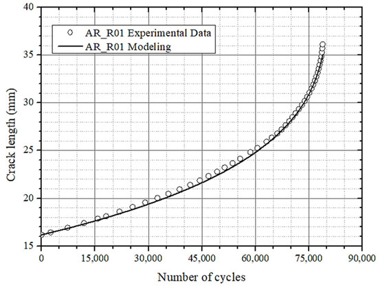 Crack length vs. number of cycles for AR-R01: experimental results and modeling.