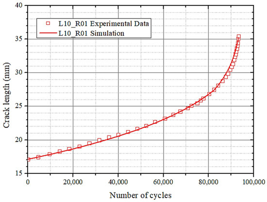 Crack length vs. number of cycles for L10-R01: experimental results and simulation.