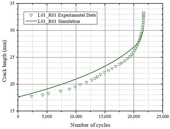 Crack length vs. number of cycles for L01-R01: experimental results and simulation.