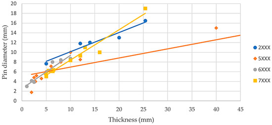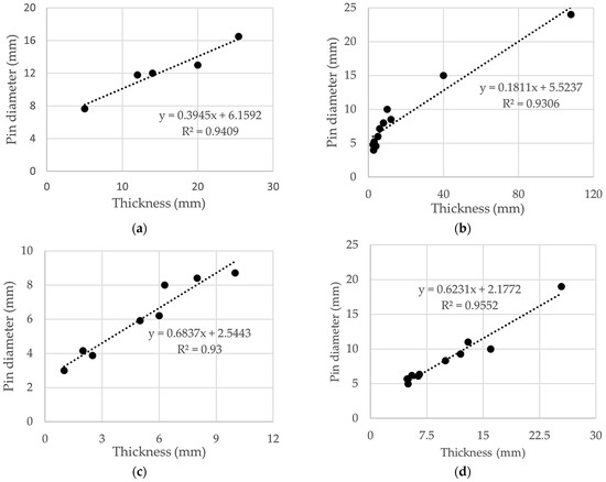 The pin is in charge of transporting the plasticized material along the joint [112]. Figure 3a–d present the pin diameter relative to material thickness; if the trial reported used a conical pin, the trend line included the largest diameter. It should be noted that the lowest R2 was 0.93, so these graphs are considered to be within the established limits. Figure 7 shows a summary of the trend lines.
