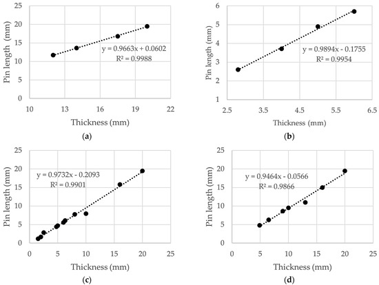 Pin length vs. thickness for series: (a) 2XXX; (b) 5XXX; (c) 6XXX; and (d) 7XXX.