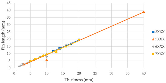 Figure 6 shows a summary of the trend lines presented previously; the overlapped slopes indicate that pin length does not depend on the type of alloy, but mainly on the thickness of the material to be welded. According to these, the difference between the pin length and material thickness should be kept between 5 and 6%, regardless of the aluminum series.