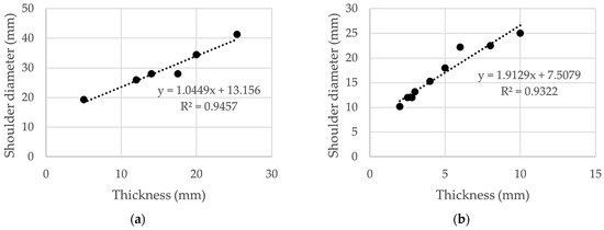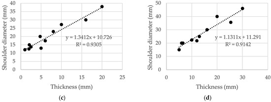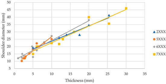 The shoulder is in contact with the surface during welding, and its function is to keep the material in position and generate most of the heat produced during welding [21]. Figure 7a–d show, according to the series, the trend line for the shoulder diameter resulting from the literature collection performed. Figure 8 is a summary of the shoulder diameter trend lines for each series. According to the trendlines, the minimum coefficient of determination was 0.9142 and the maximum was 0.9457, which are acceptable according to the threshold set.