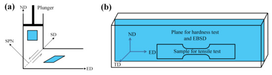 (a) Sketch of the ECAP die, showing the shear direction (SD), shear plane normal (SPN), and (b) EBSD, hardness, and tensile test measurement planes (ED-ND) with reference to the ECAP die geometry.