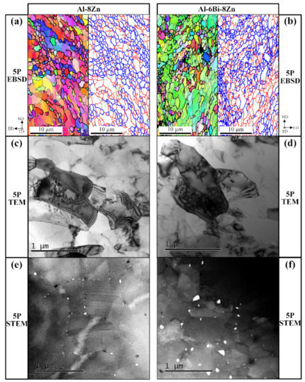 Microstructures of the 5P Al-8Zn and Al-6Bi-8Zn alloys. (a,b) EBSD, (c,d) TEM, and (e,f) STEM. In boundary maps, green, red, and blue lines depict boundaries with misorientations in the range of 2° ≤ θ < 5°, 5° ≤ θ < 15° and 15° ≤ θ < 180°, respectively.
