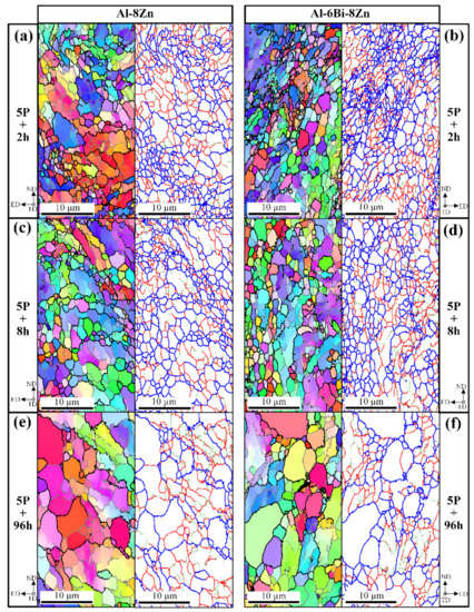 EBSD IPF maps and boundary maps of the annealed (at 200 °C) Al-8Zn and Al-6Bi-8Zn alloys. (a,b) 2 h, (c,d) 8 h, and (e,f) 96 h. In boundary maps, green, red, and blue lines depict boundaries with misorientations in the rage of 2° ≤ θ < 5°, 5° ≤ θ < 15°, and 15° ≤ θ < 180°, respectively.