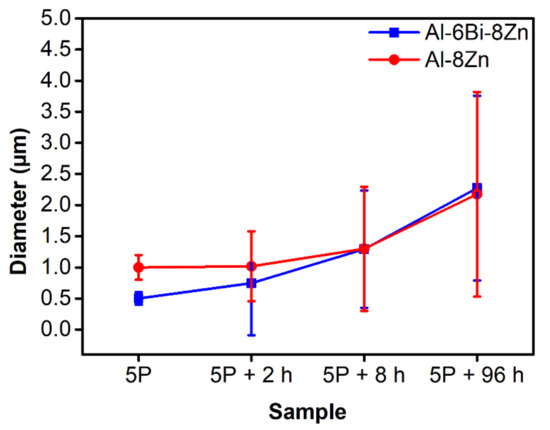 The evolution of Vickers hardness upon annealing at 200 °C as a function of time is shown in Figure 8. The 5P Al-8Zn and Al-6Bi-8Zn alloys before annealing have a hardness of 66 HV and 73 HV, respectively. Overall, the hardness continuously decreases with increasing the annealing time. In the present work, after annealing for 1 min, the decreased hardness is caused by thermally activated annihilation and rearrangement of dislocations. The decrease in the hardness of the 5P Al-6Bi-8Zn alloy is larger than that of the 5P Al-8Zn alloy. This can be mainly attributed to the faster occurrence of recovery in the 5P Al-6Bi-8Zn alloy due to the smaller grain size. After annealing for 1 h, the Vickers hardness of the Al-8Zn and the Al-6Bi-8Zn alloy is much higher than that of the ECAP-deformed commercial purity (99.5%) Al alloy (≈42 HV) after annealing at 200 °C for 1 h [24].