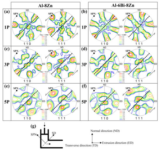 {1 1 0} and {1 1 1} pole figures of ECAP-processed Al-8Zn and Al-6Bi-8Zn alloys. (a) and (b) 1P, (c) and (d) 3P, (e) and (f) 5P, and (g) is a schematic of the ECAP die and its relevant coordinate system. The dotted lines in the pole figures indicate the ideal shear plane (SD and SPN are abbreviations for shear plane and shear plane normal).