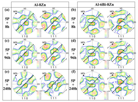 As can be seen from Figure 6a,b, the grain orientation distributions of the 1P samples are nearly centro-symmetric, showing characteristics of the ideal (pure shear) ECAP texture of FCC metals and alloys processed through a 90° ECAP die [23]. Compared to the 1P samples, the texture components of the 3P Al-8Zn and Al-6Bi-8Zn samples become more concentrated with the maximum intensity increased to ≈9.1 and 7.8 mr, respectively. With increasing ECAP passes to five, the loss of monoclinic symmetry and deviation from ideal positions occurs, which can be related to the formation of ultrafine grains as a result of CDRX. However, the similarity between textures of Al-8Zn and Al-6Bi-8Zn samples demonstrates that CDRX can only modify the ECAP texture in some extent. The effect of annealing at 200 °C on the texture of Al-8Zn and Al-6Bi-8Zn alloys is illustrated in Figure 7. A comparison of Figure 6 and Figure 7 shows that after annealing for 8 h, annealing at 200 °C is not radical enough to eliminate ECAP textures, which further confirms that the grain structures of 5P Al-8Zn and Al-6Bi-8Zn alloys are stable during annealing.