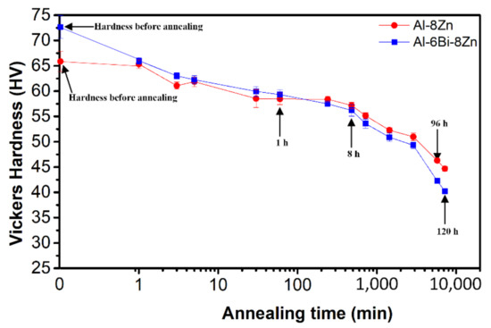 With increasing the annealing time up to 8 h, the decrease in hardness is rather slow and gradual, which is consistent with the microstructural evolution. After annealing for 120 h, the hardness of the Al-8Zn and Al-6Bi-8Zn alloys drops down to ≈43.7 HV and ≈40.7 HV, respectively. The lower hardness of the Al-6Bi-8Zn alloy should be due to the presence of soft Bi particles. The significant decrease in hardness is mainly attributed to grain growth. Compared to their as-cast counterparts, the hardness of these two alloys is still higher.