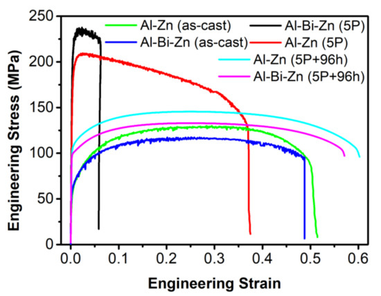 Tensile engineering stress–strain curves of the Al-8Zn and Al-6Bi-8Zn alloys.