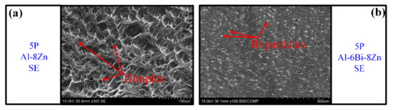 As shown in Figure 9, tensile tests were conducted on the 5P Al-8Zn and Al-6Bi-8Zn alloys after annealing for 96 h. For comparison, the tensile results of the as-cast and as-deformed 5P samples are also given in Figure 9, and the corresponding tensile properties are given in Table 1. It is apparent that for both alloys, five passes of ECAP can lead to a substantial increase in yield strength and ultimate tensile strength, with a decline in ductility. The improvement of yield strength after five passes of ECAP compared to the as-cast state is a result of increased grain boundary strengthening (≈96 MPa) and dislocation strengthening (≈49 MPa), coupled with decreased solid solution strengthening [5]. The low uniform elongation is related to the very limited work-hardening potential [5]. The tensile fracture morphologies of the 5P Al-8Zn and Al-6Bi-8Zn samples are shown in Figure 10. It can be seen that the 5P Al-8Zn sample exhibits more and deeper dimples than the 5P Al-6Bi-8Zn sample, indicating that the 5P Al-8Zn sample is more ductile. The flake-shaped Bi particles in the 5P Al-6Bi-8Zn sample cause decohesion of the Bi particle/matrix interfaces, which leads to poor ductility.