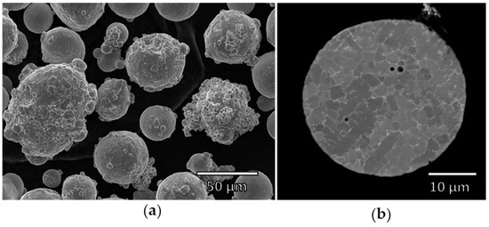 (a) SEM image of Inconel 713C feedstock powder. (b) BSE-SEM image of the cross-section of a single Inconel 713C particle.