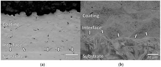 Figure 2b is the BSE-SEM image of higher magnification taken at the interface. The dendrite structure of the splats in the coating is heavily distorted compared with Figure 1b, which is also evidence of severe plastic deformation [12]. At the interface, some cracks can be observed, because metallurgical bonding usually forms at regions where jetting occurs [13]; other regions with poorer adhesion would appear as cracks in the BSE-SEM image. In the substrate, the microstructure in the region closer to the interface is distorted/refined compared to the region away from the interface, which can be attributed to the peening effect when Inconel 713C particles impact the Inconel 718 substrate.