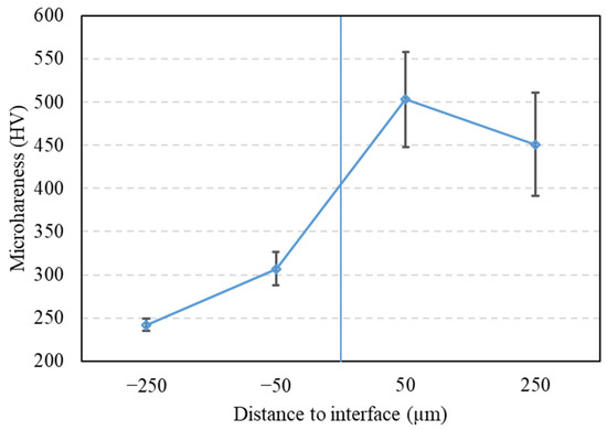 It is interesting to note that Vickers hardness values are higher (~500 HV) when the indentation was conducted at a short distance of 50 μm away from the interface compared with that further away at 250 μm (~450 HV). This may be attributed to the peening and grain refinement effect from the Inconel 713C particles. In the substrate, regions close to the surface were shot peened and underwent grain refinement by the high-velocity particles; thus, hardness in those regions increased following the Hall–Petch relationship. The regions further away from the top surface were hardly affected.