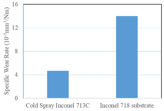 Specific wear rates of cold spray Inconel 713C coating and Inconel 718 substrate.