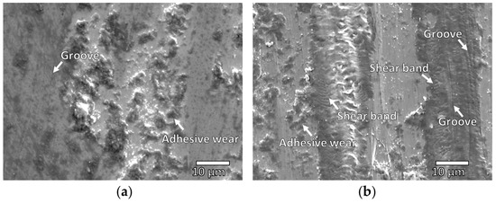 Another main wear mechanism for both the Inconel 713C coating and the Inconel 718 substrate is adhesive wear. Due to the adhesive force between the counter ball and the wear track, some material from the coating or substrate could be detached and transferred to the counter ball. The remaining material was deformed, leading to the unevenness of the wear tracks (Figure 7). Long shear bands in the shape of fish scales were discovered on the wear track of the Inconel 718 substrate (Figure 7b), while none exist on the wear track of the Inconel 713C coating. Since the hardness of the substrate is low, adhesion force could exceed the shear strength of the substrate and resulted in the excessive deformation where shear bands were formed [19]. The grooves (Figure 7) caused by abrasive wear [20] are scarce on wear tracks of both coating and substrate, but also due to lower hardness, more grooves are found on the Inconel 718 substrate as compared to those on the Inconel 713C coating.