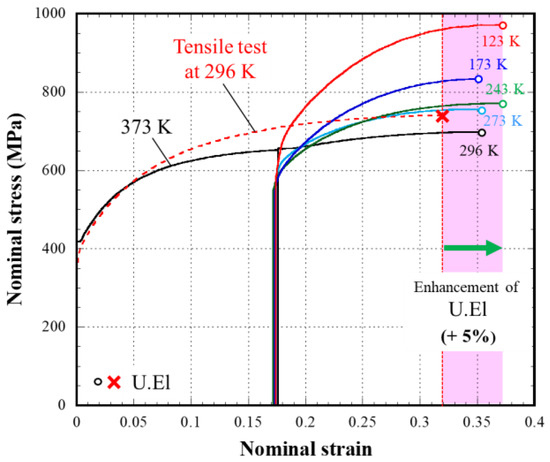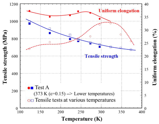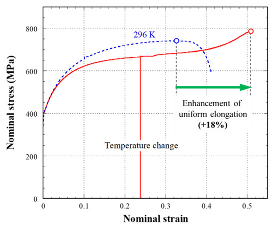- On the other hand, when the deformation temperature was decreased continuously during the tensile deformation, a very large U.El of 51% was obtained. This value was about 1.5 times larger than that obtained in the tensile test at room temperature.