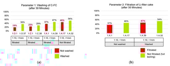 - Filtration of Li-filter cake or full boiling: full boiling describes the removal of H2O in the laboratory beaker. Filtration stands for filtering the precipitating Li2CO3 at a minimum liquid volume. Hence, there are losses in the residual filtrate. Filtration is conventionally used after acidic leaching to avoid a co-precipitation of acid components and chemical additives;