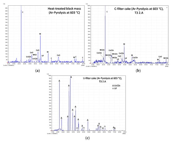 - When leaching heat-treated black mass in H2O, the solution is basic. This can be attributed to the dissolution of basic phases in the liquid. → LiF and Li2CO3 could be detected in the heat-treated black mass by XRD; both phases are slightly soluble and therefore are responsible for the elevated pH-value. Although LiOH and Li2O could not be detected via XRD-analysis in the heat-treated black mass, they may be present in small amounts since the SEI-layers consist of Li2CO3, LiF, LiOH and Li2O [93]. However, it was shown that LiF decomposes to HF and LiOH in aqueous solutions, which indicates Li+ + OH− in the solution.