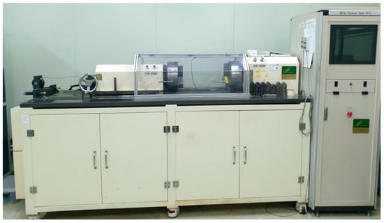 To examine torsional ductility, torsion tests were carried out as free-end twist tests at a rotational speed of 30 r.p.m. The torsion test machine (Hongduk Eng., Busan, Korea) (Figure 1) equipped with torque sensors. The length of cold drawn steel wires was chosen as 200 mm. Tension was applied to the specimen by using a weight of 1% of the maximum tensile load of the wire. During torsion testing, the occurrence of delamination was evaluated by assessing NT or examining the shape of fracture surfaces.