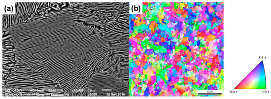 SEM micrograph (a) and inverse pole figure (IPF) map (b) of a hypereutectoid steel wire transformed at 620 °C.