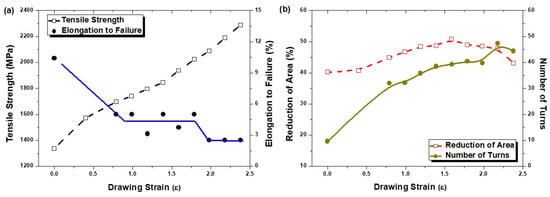 In Figure 3a, a drawing strain of 2.38 increased TS continuously from 1335 (as-transformed) to 2287 MPa, due to work hardening of lamellar ferrite and solid solution hardening of carbon atoms dissolved in lamellar ferrite, which was caused by the occurrence of dynamic strain aging. According to Zhang et al. [34], TS of cold drawn pearlitic steel wires can be expressed with the following strengthening mechanisms: (1) boundary strengthening, which represents the refinement of interlamellar spacing; (2) strain hardening of ferrite; and (3) solid solution hardening due to the increased amount of carbon atoms dissolved in lamellar ferrite. The process of dynamic strain aging consists of the fracture and decomposition of lamellar cementite, and the interaction of dissolved carbon atoms with dislocations in lamellar ferrite during deformation [23,25,27]. The rapid increase of TS above a drawing strain of 1.5 in Figure 3a was attributed to the increased solid solution hardening of carbon atoms at high strain and the efficient work hardening of completely realigned lamellae along the wire axis, compared with the less work hardening during the progressive realignment of randomly oriented lamellae at low strain. The increase of TS during wire drawing was attributed to strain hardening of lamellar ferrite and solid solution hardening of dissolved carbon atoms by dynamic strain aging.