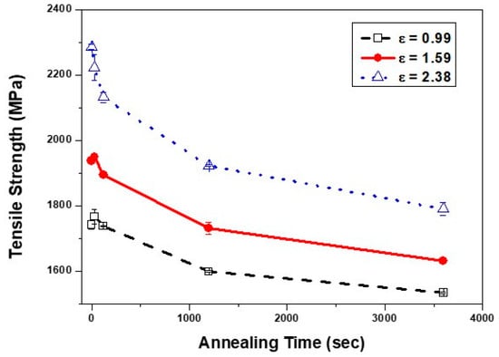 It is interesting to note that the degree of age softening during annealing in Figure 4 was significantly influenced by the amount of drawing strains in cold drawn steel wires. A steel wire with ε = 2.38 showed the larger decrease of TS, 496 MPa, than that with ε = 0.99, 208 MPa, for 1 h annealing. The more damage and fracture in lamellar cementite and the higher dislocation density in cold drawn steel wires received the higher drawing strain that would accelerate the age softening process during annealing. Thus, annealing of a steel wire that received a high drawing strain showed the larger decrease of TS than that with a low drawing strain.