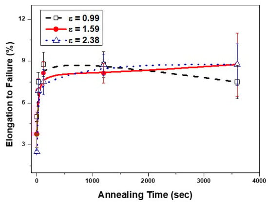 In Figure 6, post-deformation annealing raised EL continuously with annealing time. EL of cold drawn steel wires increased rapidly by 2.5% (ε = 0.99) and 3.1% (ε = 1.59) for a short annealing time of 30 s, although TS increased due to age hardening at the same condition. This implies that the effect of age softening, such as the recovery of ferrite and the spheroidization of lamellar cementite, would have the stronger effect on EL than the age hardening effect. Meanwhile, the increasing rate of EL slowed down or EL saturated at the 8–9% level for an annealing time above 2 min.