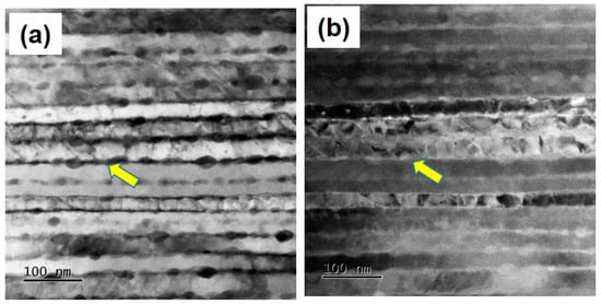In Figure 3a, EL (10.4%) of a transformed steel wire dropped to 5.6% at a drawing strain of 0.79, decreased gradually with drawing strain, and reached a saturation value of 2.5% for a drawing strain above 2.0 [17,35]. It is interesting to note that the rapid drop of EL occurs even at a low strain of 0.79. According to Zhang et al. [34,36], the dislocation structure in lamellar ferrite transformed from threading dislocations, tangles at low and medium strains, to dislocation cells at high strain. In pearlitic steels, the bundle of dislocations ending at ferrite/cementite boundaries act like dislocation cell boundaries during plastic deformation, due to the existence of lamellar cementite. The presence of dislocation tangles in Figure 5 indicated that the formation of dislocation tangles, i.e., the formation of dislocation substructures, would become one of the main causes for the EL drop at low strain. He et al [37] reported that the formation of dislocation tangles was observed at a drawing strain of 0.8 in cold drawn steel wires.