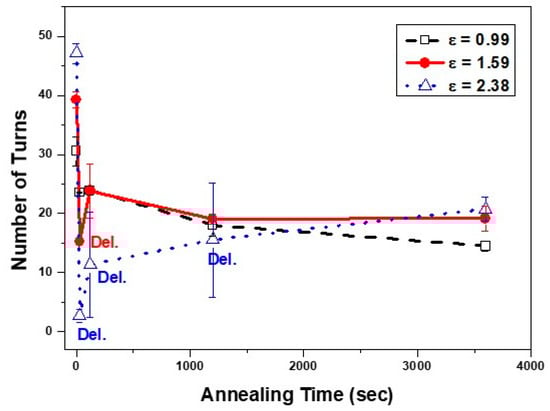 In Figure 8, NT showed the steady decrease with annealing time, except for the drop of NT region. DEL, which is closely related to the interaction of dissolved carbon atoms with dislocations in lamellar ferrite, would cause the drop of NT in torsion. In Figure 8, steel wires with the higher drawing strain showed the larger range of the DEL region and the larger decrease of NT during annealing. The higher drawing strain induced more damage in lamellar cementite during wire drawing. The damaged cementite easily dissolved in ferrite during annealing. The increased amount of dissolved carbon atoms interacted with dislocations more frequently. Thus, the higher drawing strain resulted in the larger drop of NT and more frequent DEL during annealing [11,25]. Additionally, the disappearance of DEL with 2 min annealing at 500 °C in steel wires received a strain of 1.59 indicates that the increase of annealing time would decrease the amount of dissolved carbon atoms, due to the reprecipitation of cementite particles [9]. NT of steel wires drawn with ε = 0.99 decreased continuously from 30.6 turns (as-drawn) to 14.5 turns (1 h annealing) without the occurrence of DEL. Except for DEL, NT of cold drawn steel wires decreased continuously with annealing time at 500 °C.