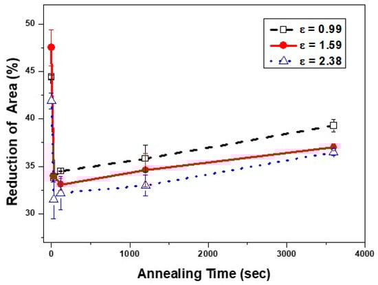 Generally, annealing of cold deformed steels improves ductility of EL, RA, and torsional ductility at the expense of strength in cold deformed steels, since the occurrence of recovery or recrystallization during annealing encourages the softening of matrix. However, the variations of RA with annealing time in Figure 9 showed the different behavior from that of EL. For a short annealing time of 30 s, RA of cold drawn wires (ε = 1.59), 48%, significantly dropped to 34%. Meanwhile, the increase of annealing time from 30 s to 1 h resulted in only the 3.5% increase of RA.
