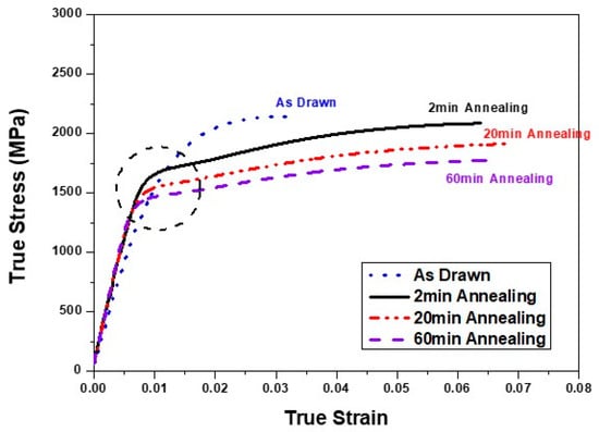 True stress–true strain curves of steel wires drawn with a strain of 1.59 and annealed at 500 °C for 2 min to 1 h.